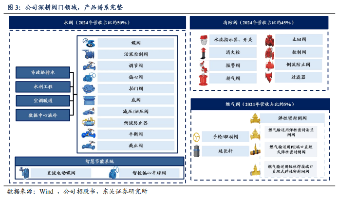 技术创新引领行业,全球化生产与服务体系深厚:(1)产品谱系纵深发展,核心技术自主可控: 公司产品涵盖150多个型号、2000多个规格,广泛应用于市政给排水、消防、暖通及燃气系统。其自主研发的“不停水加装阀门”技术获得国家发明专利,填补了国内行业空白。(2)全球化进展显著,海外营收占比领先:海外营收占比长期保持 75%左右,产品远销全球70多个国家和地区,并在美国、英国、沙特、中国香港、泰国设有控股子公司,构建了成熟的国际销售网络与本土化生产能力。