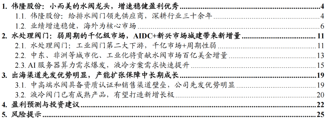中高端水阀市场准入资质、销售渠道壁垒较高:(1)资质认证壁垒:水务为民生大事,欧美等发达国家对水阀均根据不同行业制定了不同的标准,对供应商生产流程、产品质量等要求严格,且审核周期较长。部分业主方还要求阀门厂进入供应商名单,如沙特要求供应商通过沙特阿美的9COM 认证或SWCC供应商预审,阿布扎比要求供应商进入ADSSC或EWEC的供应商名册,才可参与投标。(2)销售渠道壁垒:水处理阀门行业参与者众多,成熟的品牌、完善的销售网络和高响应的售后服务为壁垒之一。此外,沙特的IKVA计划鼓励企业在当地投资,于沙特本地有投资、雇佣和售后的厂商更容易中标。在此背景下,我们看好伟隆股份成长性:①公司海外资质认证完备、渠道建设较成熟,于泰国、沙特已有产能,先发优势明显。随海外工厂产能释放,关税等压制公司外销的因素逐步消解,公司将充分受益于新兴市场水阀需求的增长。②公司2018年切入数据中心领域,目前已有成熟产品向微软数据中心等供货,主要销往北美和东南亚。公司的液冷阀门覆盖一二次侧,冷却塔、管路以及CDU环节均有。相较海外供应商,公司具备交期短等优势,随客户认可度提升,液冷阀门有望成公司又一增长极。