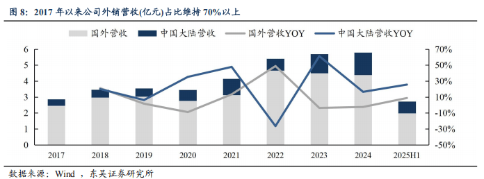 分区域,公司海外营收占比七成以上:(1)海外:公司海外收入占营收长期维持在 70% 以上,以美、欧等发达国家和地区为主,毛利率领先于国内约20pct。2017-2024年公司海外营收由 2.5亿元增长至4.4亿元,CAGR 为9%。近两年公司海外增速放缓,我们判断系关税扰动和公司产能瓶颈,随泰国、沙特产能投建,外销增速有望修复。(2)国内:上市以来公司主动加大对国内市场的布局力度,2017-2024年收入由0.4亿元提升至1.4亿元,CAGR约20%,占比也由 2017 年的 14% 提升至 2025上半年的 27%,为公司提供新增长点。