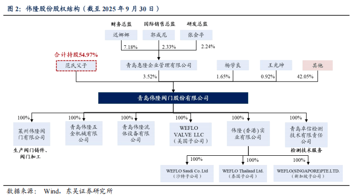 范氏父子控股民营企业,股权结构稳定。截至2025年9月30日,范庆伟合计持有公司股份约51.73%(含个人直接持股及通过青岛惠隆间接持股),为公司实际控制人;其子范玉隆直接持股约3.24%,二人为一致行动人。此外,公司高管郭成尼(国际销售总监)、迟娜娜(财务总监)、张会亭(研发总监)通过青岛惠隆企业管理有限公司间接持有公司股份0.41%,核心团队与公司利益一致,激励充分。