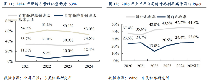 由于高端市场对品牌和渠道要求较高,公司在欧、美以贴牌代工为主,2024 年贴牌占营收比重约为 53%。