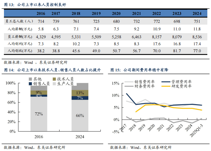 公司人力成本和费用控制良好,期间费用率稳中有降。2017-2024年,公司期间费用率从19.4%下降至16.0%,累计下降3.4pct。2025年前三季度,公司期间费用率16.2%,同比上升0.4pct,其中销售/管理/研发/财务费用率分别为5.9%/5.9%/3.9%/0.4%,同比分别-0.4/-0.5/+0.1/+1.1 pct,可转债计提利息、美元走弱背景下,费用率保持稳定。展望后续,随规模效应释放,公司费用率有望保持稳中有降的态势。